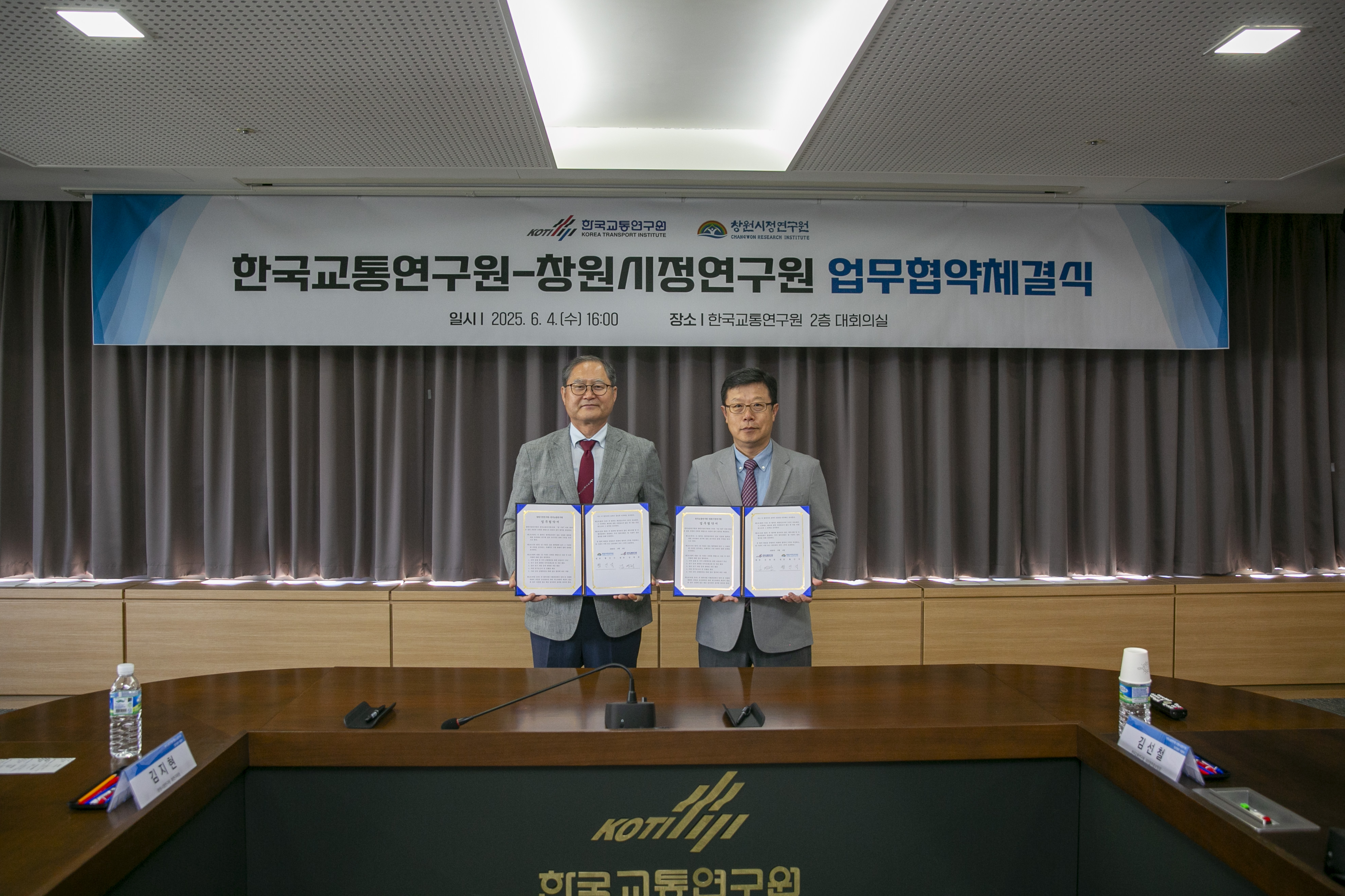 On 4 June 2025, the Korea Transport Institute (KOTI), led by President Kim Youngchan, and the Changwon Research Institute, led by President Hwang lnsik, held a signing ceremony for a memorandum of understanding (MOU). The MOU aims to establish a cooperative relationship for joint research projects and information exchange between the t wo institutes. In attendance at the ceremony were KOTl's President Kim Youngchan; Vice President Shin Heechul; Director-General of the Road Transport Research Division, Cho Hansun; Director-General of the Rail Transport Research Division. Lee Ho; Director-General of the Logistics Research Division, Min Yeonju; Director of the Planning and Coordinati on Office, Kim Dongjun; and Director of the External Cooperation and Public Relations Team, Kim Seoncheol. From Changwon Research Institute were President Hwang lnsik; Director of the Urban Space Research Division, Yoon Jaebong; Director of the Research Planning Team. Kim Daeyeong; Director of the Changwon Port Logistics Research Centre. Kim Woongseop; and Director of the Changwon Youth Policy Research Centre, Hwang Hwiwook were in attendance.