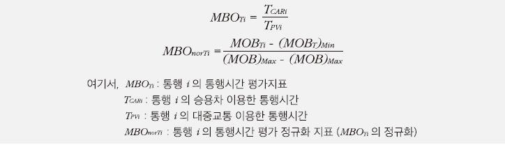 승용차 대비 대중교통 통행시간 평가 지표는 승용차와 비교하여 대중교통 통행시간이 얼마나 되는지를 판단할 수 있는 지표이다. 지표값으로 승용차 대비 대중교통 통행시간의 비율을 직관적으로 판단할 수 있다. 또한 이를 정규화한 지표(0~1 사이의 값)를 통해 분석하고자 하는 통행 유형 그룹에서 본 지표의 수준이 어느 정도인지 판단할 수 있다.