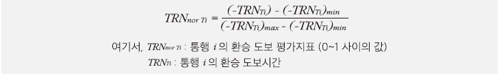 환승도보시간 평가 지표는 출발지로부터 최종목적지까지 통행하는데 대중교통 수단을 환승하기 위해 발생되는 도보시간을 평가한다. 도보시간이 길수록 대중교통을 이용하기에 불편성이 높아져 취약하다고 판단할 수 있다. 본 지표값은 0과 1사이의 값으로 계산되고, 값이 작을수록 취약하다는 것을 의미한다.