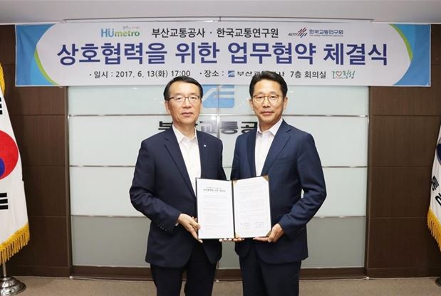 한국교통연구원(원장 이창운)과 부산교통공사(사장 박종흠)는 6월 13일(화) 오후 5시, 부산교통공사 7층 회의실에서 양 기관 업무협약을 체결하였다.